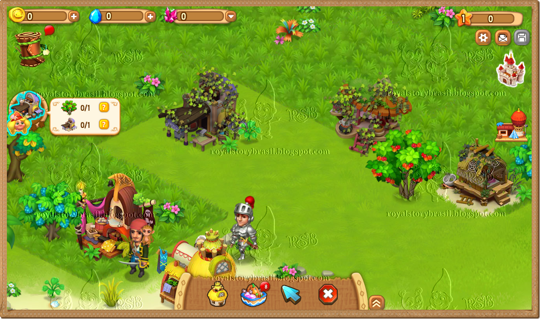 - Opções: configure as características do jogo, cartão "automático" salvar dados das suas ações e, o centro de mensagens onde estarão os itens pedidos aos seus vizinhos e as solicitações de ajuda (as solicitações da ilha também aparecerão no centro de mensagens do reino).